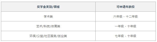 奖学金项目涵盖不同学习阶段(新生入学、在校生)、不同学习领域(学术成就、艺术/音乐/体育成就、环保/公益/社区服务/创业);并按一定比例涵盖部分学费。