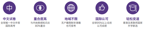 HKDSE香港中学文凭试,即香港高考,简称DSE,与IB、A-Level、SAT等国际升学考试齐名,是全球唯一可以选择中文试卷考试并以中文作答的国际升学考试,成绩受香港、澳门地区以及全球QS名校认可。2012年对内地高中学生开放,课程全面衔接内地初高中课本知识,是中国学生最优的国际中文升学路径。