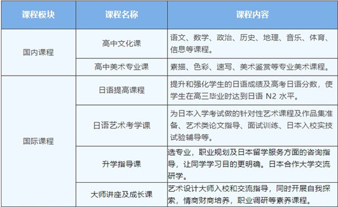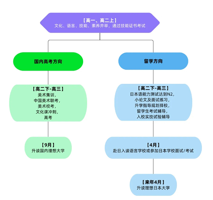 佛山市岭美双语特色日语双语班与日本优质语言学校和艺术私塾达成共建合作,采用“3+1”升学模式。3年国内综合能力培养(高中文化课程+日语提升+美术实技指导+EJU留考),1年日本备考(日语、美术专业强化),助力学生高效实现日本艺术留学。