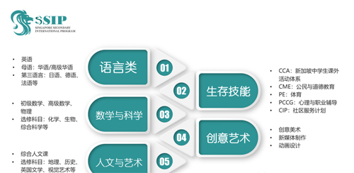 新加坡SSIP国际高中课程体系(Singapore Secondary International Program)以新加坡公立中学课程体系为基础,采用新加坡特色双语教学模式。学生完成新加坡中学学分,并参加毕业考试,取得新加坡政府中学毕业文凭(新加坡教育部O-Level),凭毕业成绩进入新加坡国内教育升学通道,升入新加坡高校,或者澳、英等其他国家名校。我校是SSIP课程上海授权合作学校。