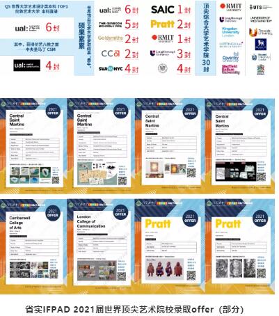 省实IFPAD2021届学子再续历届毕业生的辉煌佳绩,斩获包括英国伦敦艺术大学(QS 世界大学艺术设计类本科第1)中央圣马丁CSM(伦艺六院之首)等近百封来自世界各地著名艺术院校及综合类大学的本科直录offer !