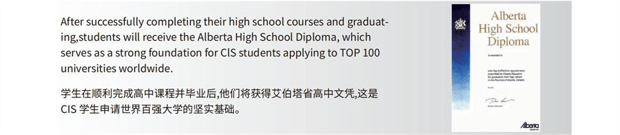 CIS开设的加拿大艾伯塔课程体系经过百年磨砺,在全球范围超过4000所大学(其中包含所有排名前100大学)均承认艾伯塔课程的高中毕业证,注册入读CIS学校的学生也会相当于在加拿大教育系统注册。