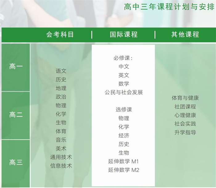 中文、英文、数学、公民与社会发展;选修课:物理、化学、经济、历史、生物、延伸数学 M1、延伸数学 M2。
