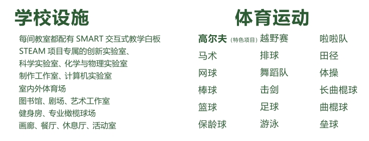 同步美国顶级私立高中课程体系设置,严格打造扎实的学术基础,确保学生可以满足美国名校的学术要求。与此同时将国际赛事,艺术体育、公益活动等课程融入其中,包含:“爱丁堡国际奖”户外探险活动、AMC数学建模大赛,马术课、飞行课、吉他课等,学校拥有三十余社团活动供学生选择。