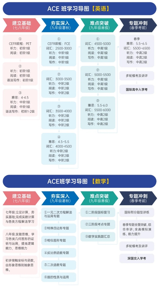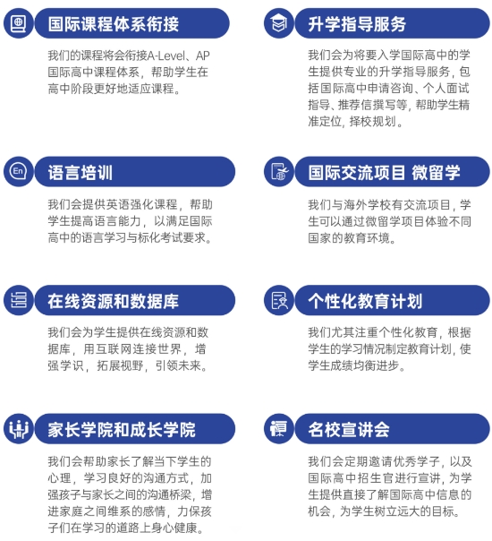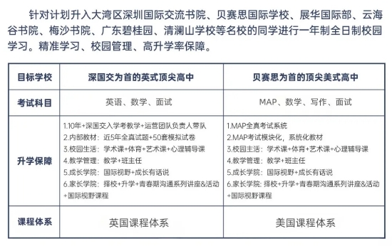 针对计划升入大湾区深圳国际交流书院、贝赛思国际学校、展华国际部、云海谷书院、梅沙书院、广东碧桂园、清澜山学校等名校的同学进行一年全日制校园学习。精准学习、校园管理、高升学率保障。课程以英语和数学为主,英语的教学深度对标欧洲语言框架第四个级别及以上(共6个级别),数学课程教学深度超过中考数学。