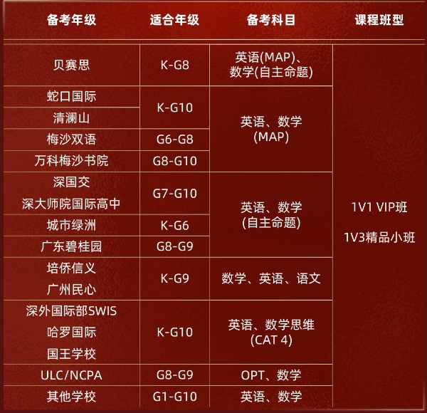 贝赛思、深国交、城市绿洲、培侨、深大师院国际高中、华附AP、广州民心、科爱赛、蛇口国际、清澜山、梅沙、深外湾区、深外国际部、哈罗国际、国王学校、南山国际等全部国际学校,全年级入学备考全覆盖。