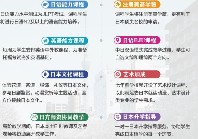 为满足更多以日本为目标留学国的家庭需求,常春藤小和山校区开设“日本EJU升学课程“,学校将通过中日双语教学模式,在国内完成日语等级考试及日本留学生考试培育课程,同时辅助日本升学指导,确保学生在有保障的基础上,挑战东京大学、早稻田大学等日本知名院校。