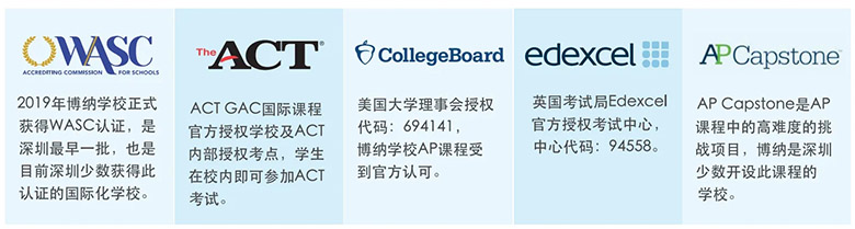 经过十年的办学发展,博纳学校受到国际和国内的广泛认可,已经成为美国西部院校联盟(WASC)、美国大学理事会(CollegeBoard)、ACT、Edexcel等国际权威的认证和授权学校,同时在众多国际学校排名中,博纳学校多次跻身深圳十强、广东省二十强和全国七十强。