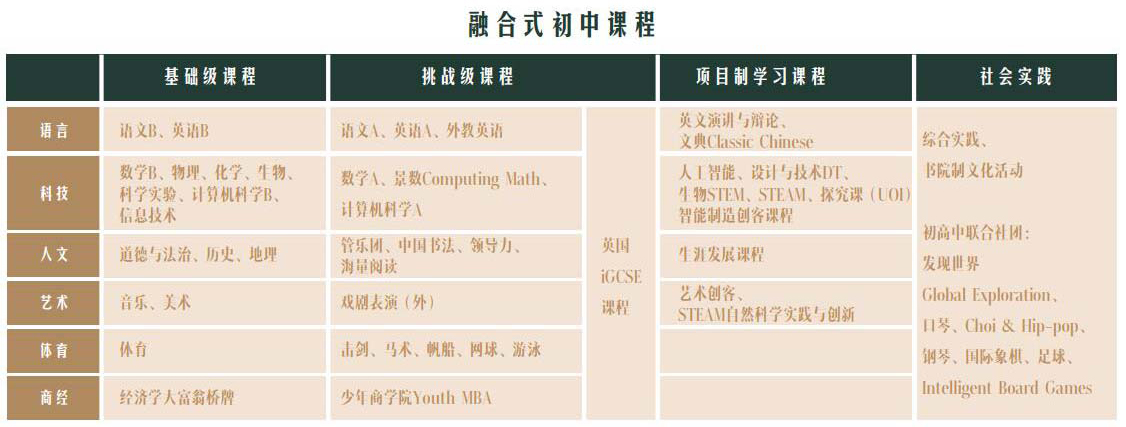 初中部全面贯彻中国教育部印发的《义务教育课程标准》《中小学综合实践活动课程指导纲要》以及《义务教育课程设置实验方案》等指导性文件,开足开齐国家义务教育课程。其中,初三以校本课程方式提前开设英国iGCSE课程。除此之外,为满足个性化教育和实现全人教育理念,以“学生成长为中心”,与国科大及国内外优质实践学习中心整合打造丰富多彩且体现办学价值的EFF(Education For Future)校本课程,包括Scratch/C/C++计算机编程、STEM课程、国学经典(含金陵文化)、土壤环境科学、植物科学、动物科学、创意艺术、空间艺术、综合探究(UoI:Unit of Inquiry)、打击乐器、游泳、网球、3D打印、DT设计与技术、物理实验、化学实验和生物实验等40余门供学生自主选择。重点培养学生的外语应用能力、科学实践和创新能力、领导力与企业家精神、终身体育运动技能及运动社交、艺术气质修养及艺术才能、信息能力等未来人才素养,旨在培养学生应对未来变化的全球胜任力。