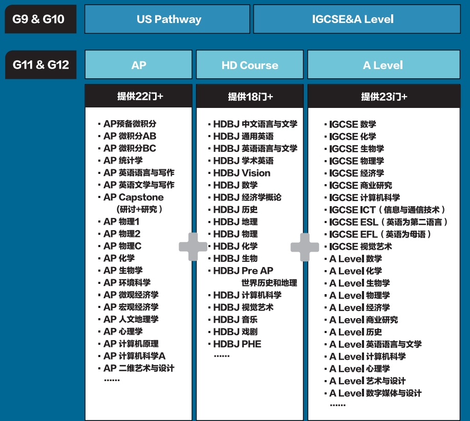 赫德高中9-12年级,开设了IGCSE、AP、Alevel课程,具体课程设置见下图: