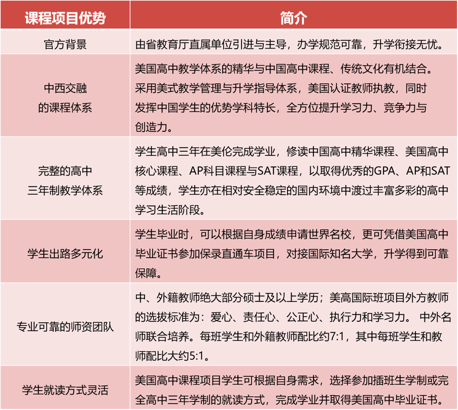 (1)美国高中课程与AP课程是广东省教育厅直属单位广东教育国际交流服务中心(简称粤教国际)与佛山美伦教育中心全力合作打造的高中课程项目。课程项目引入美国马丁路德高中全套课程、教学管理及升学规划体系,由美方学校直接派出符合其授课教学管理要求的师资和管理团队进行项目运营。更结合国内普通高中学业要求与美国纽约马丁路德中学课程,融合中西方优质教育理念,形成结构完备且内容丰富的高中课程体系,旨在全方位培养学生的基础学科应用能力、逻辑思维与批判性思维能力。