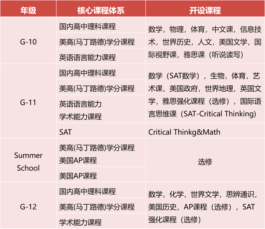 (1)主要学分课程是结合国家普通高中学业要求与美国马丁路德中学的学科设置,设计和开设的基础学科必修课程和体能体育课程。
