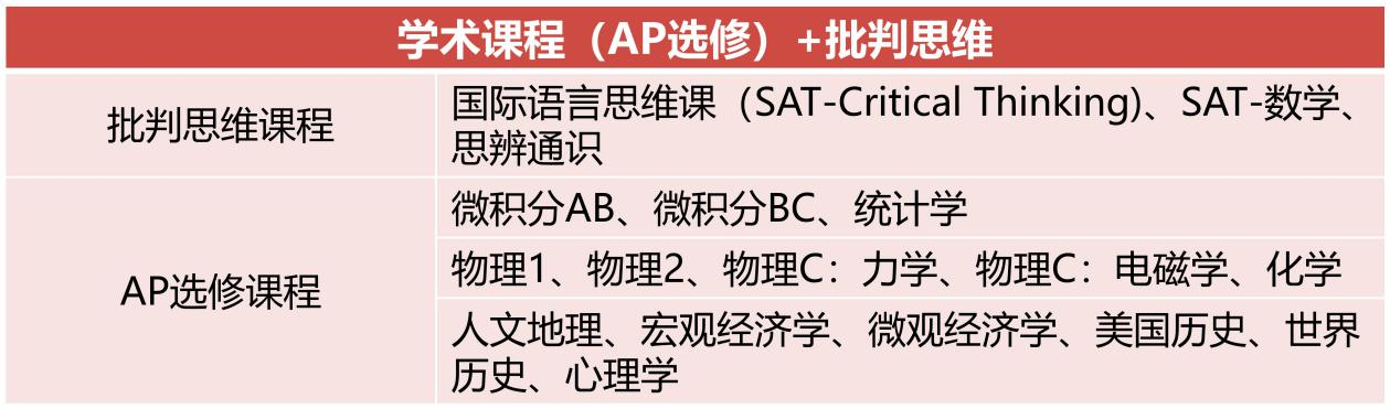 (3)学术课程是为英语标准化考试(雅思、SAT等)作培训和准备的英语学习课程。学生可按个人能力选修的美国AP课程,为学生顺利申请国际名校作全面准备。