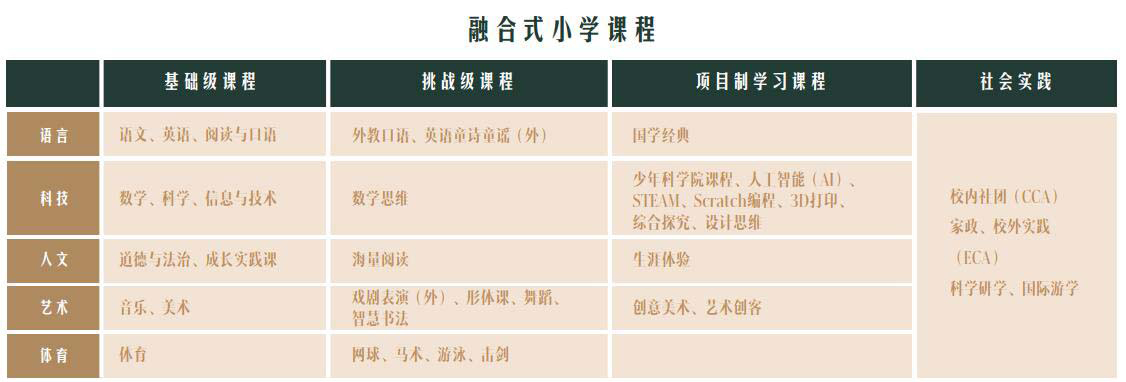 在小学低龄段,学校注重孩子整体发展并为其提供个性化的学习路径和教育服务,针对每个孩子的特点,以个性化的教育方式构建他们与知识世界、自我世界和人类世界之间的联系。在小学阶段,学校更重视保护好奇心、培养无畏探索精神和同理心、养成好习惯、习得才艺、发展批判性思考能力、培育学生健康身心和丰富的灵魂。尤其到了小学高龄段,为满足个性化教育和实现全人教育理念,以“学生成长为中心”,与国科大及国内外优质实践学习中心整合打造丰富多彩且体现办学价值的EFF(Education For Future)校本课程,包括Scratch/C/C++计算机编程、STEM课程、国学经典(含金陵文化)、土壤环境科学、植物科学、动物科学、创意艺术、空间艺术、综合探究(UoI:Unit of Inquiry)、打击乐器、游泳、网球、3D打印、DT设计与技术、物理实验、化学实验和生物实验等40余门供学生自主选择,重点培养学生的外语应用能力、科学实践和创新能力、领导力与企业家精神、终身体育运动技能及运动社交、艺术气质修养及艺术才能、信息能力等未来人才素养,旨在培养学生应对未来变化的全球胜任力。