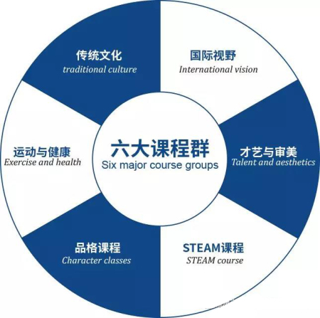 在确保义务教育阶段国家规定的课程基础上,本着“学为中心、涵养底蕴”的课程理念,围绕传统文化、国际视野、才艺与审美、运动与健康、STEAM课程、品格课程六大课程群,坚持课程原创,课程整合,学科融合。