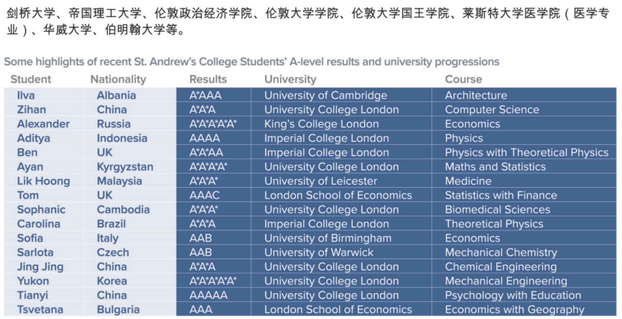 英国剑桥圣安德鲁斯学院部分学生A-level成绩报告及大学录取情况