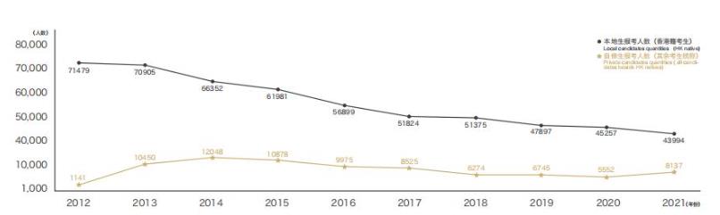 DSE中国香港高考:从2012年首届向内地生开放报考人数达到72,876人,到2020年跌至52,687人,降幅高达28%,随着中国香港出生率的持续低迷,内地考生选择参加DSE中国香港高考的竞争压力会较为缓和。