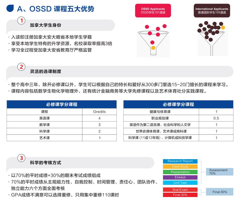 OSSD,加拿大安大略省高中学历,是全世界最先进的非应试教育中学课程体系之一,以其优质严格的教学管理在全世界高校具有极高的认可度,是进入加拿大、美国、英国、澳大利亚等全球大学的通用文凭。