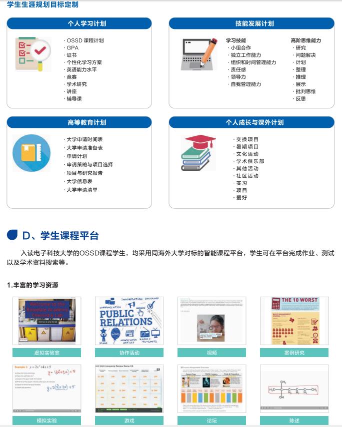 项目由电子科技大学官方主办,授权信息与通信工程学院引进全球认可的国际权威课程体系,以OSSD课程为核心设计,联合来自加拿大知名学府的课程研发团队共同打造。搭配专业的教学和申请规划团队,在针对性强化中国学生基础学科教育和能力基础上,能够大幅度帮助学生提升学习能力、学术能力和英语水平,为学生提供多元化的海外名校升学路径。全方面培养大学能够顺利毕业能力的、未来社会需要的国际化人才。