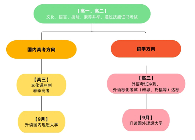 英语为必修课程,根据升学方向,选修日语或韩语。英语方向开设雅思备考课程和升学指导课程,学生可选择国内高考、高考成绩+雅思成绩、为学生提供国内高考和留学双升学路径,开启英美升学通道。