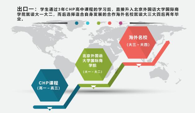 出口一:学生通过3年CHP高中课程的学习后,直接升入北京外国语大学国际商学院就读大一大二,而后选择适合自身发展的合作海外名校就读大三大四后两年毕业(3+2+2模式)