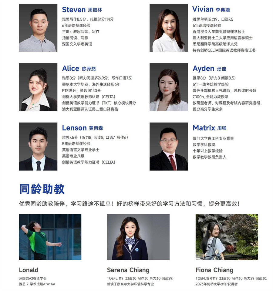 人均雅思8分以上、教学经验5年以上的英语大咖,他们不仅英语能力扎实,更懂得如何个性化教学。他们对雅思、托福、国际学校入学考等研究多年,熟悉考试题型,拥有独家教学经验,长期帮助学生高效提分。