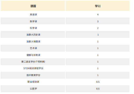 学生需要修读17个必修课和13个选课才能获取安大略省高中文凭(OSSD)