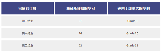 学校会对国际学生在转换成绩的本国的所有高中课程进行评估,完整和正式的成绩单是必要条件之一。学校会把学生在国内学过的课程和级别与加拿大的该课程相比,来衡量学生能转换多少学分。以下的表格显示了学分转换机制。(注:此表格只做为参考)