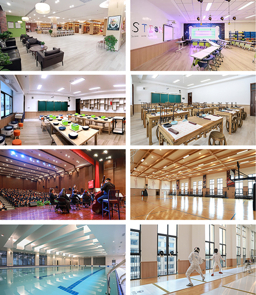 新华公学不仅配有先进的教学设施,还有完备的体育场馆等,如:图书阅览室、多功能教室、STEAM教室、地理教室、音乐教室、舞蹈教室、钢琴房、美术教室、书法教室、陶艺室、劳动室、戏剧教室、塑胶跑道操场、室内外篮球场、四季恒温泳池、乒乓球室、羽毛球场、网球场、壁球室、击剑馆、健身房等。