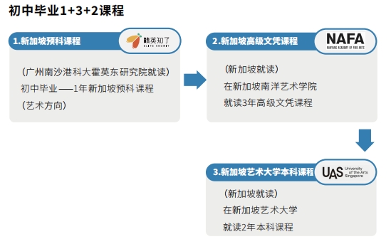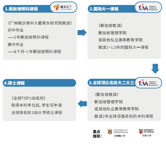 精英知了新加坡预科课程中心是新加坡管理学院SIM及新加坡艺术大学在国内合作单位。学生初三毕业,在预科中心学习2年后(艺术项目可在国内学习1年),即可进入世界顶尖名校在新加坡校区学习,2-3年内拿到世界顶尖名校的本科学位。时间短、学历高,费用仅为传统留学路径的25%,交通便利留学安全,深受湾区家庭青睐。