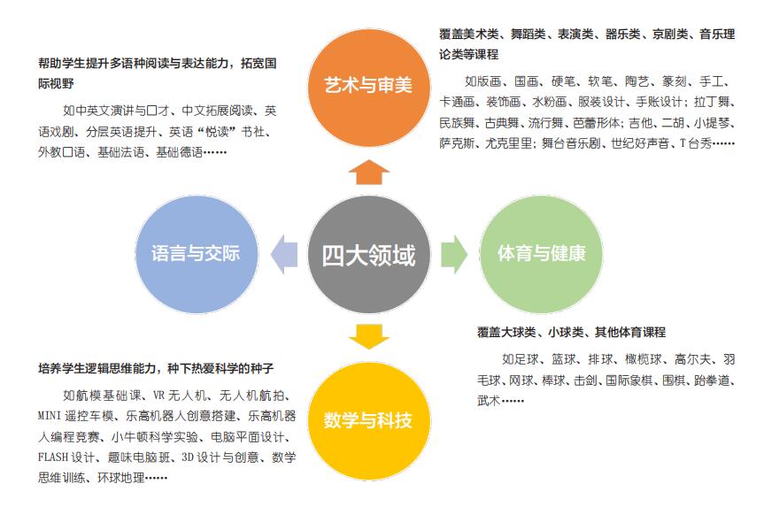 我们在课后时间开设近100个兴趣班,围绕四大领域开展:艺术与审美、体育与健康、数学与科技、语言与交际。全面满足学生成长需求,解决家长接送孩子的后顾之忧。