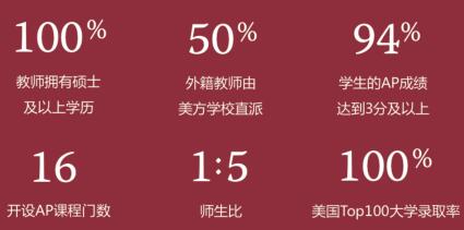 学校开设美国高中课程与AP课程(Advanced Placement)。到目前为止,我校可向学生提供16门AP课程,其中包括文学和语言、数学、自然科学、人文、艺术,计算机等,教学团队丰富的教学经验与课程管理能力为学生持续提供高质量AP教学。