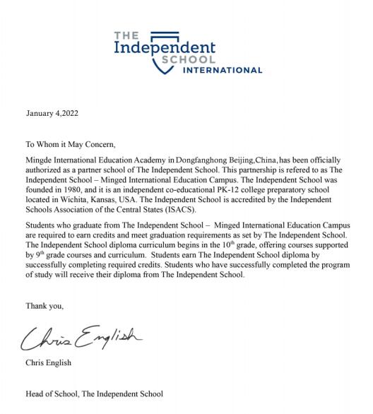 四、THE INDEPENENT SCHOOL(独立学院)授权及毕业证书样本