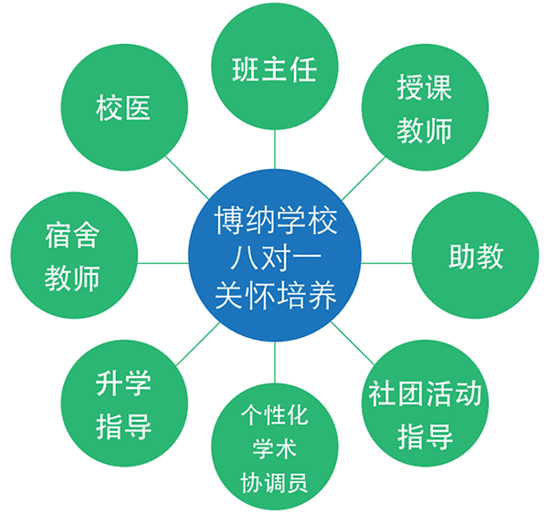 在个性化学生培养上,博纳学校实行“八对一”的培养和关注模式,通过班主任、授课老师、助教、社团活动指导、学术支持、升学指导、宿舍老师,实现对学生全方位的培养和关注,真正实现关注到在博纳的每一位学生。