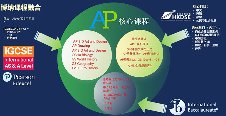 博纳学校的课程融合与创新一直在进行中,博纳在以美国公共核心课程(CCSS)为基础的前提下,通过GAC ACT融合课程以及在学生的高级阶段,提供更多融合性与高挑战的课程,包括:AP课程、A-Level艺术与设计、AP顶石课程、IB电影课程、IB话剧课程等等。以满足更多同学多元化的学习需求和全球顶尖名校的入学要求。