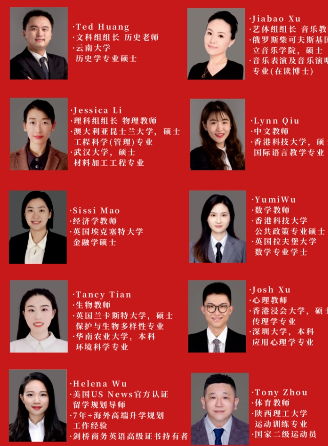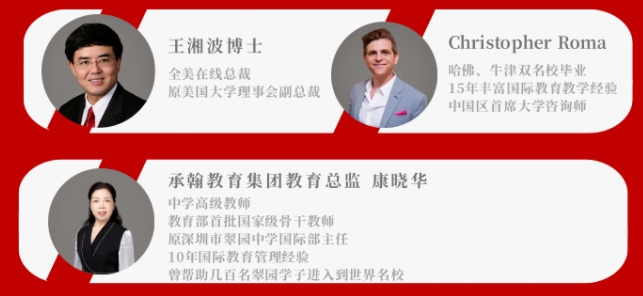 顾问和领导团队中,既有来自曾任职美国大学理事会及哈佛、牛津毕业具有丰富国际教育经验的外国专家,也有长期从事国际教育的国内专家,国内外专家均有国际教育名校工作经历和留学教育突出成就。