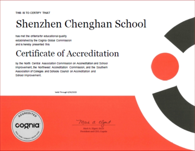 深圳市承翰学校的国际理解课程经深圳市教育局批准(【2011】588)而开设,通过全球最大的非营利性国际学校权威认证机构Cognia认证,学历和成绩单全球认可。