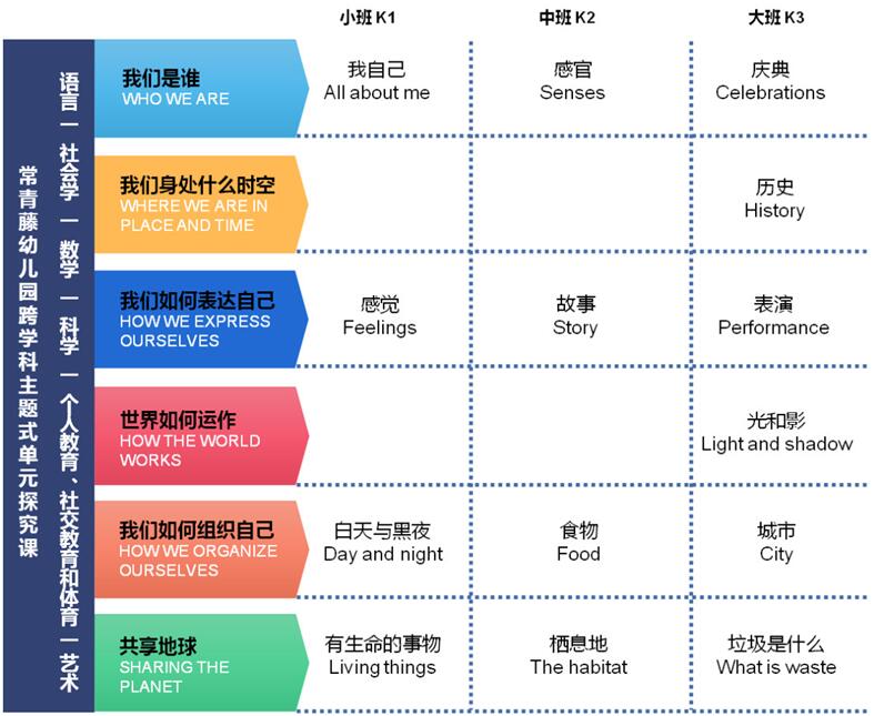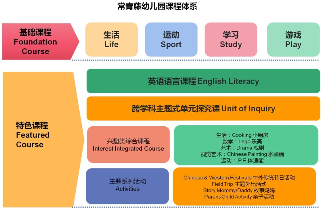 学校汲取集团二十余年托幼、中小学、中西融合课程办学经验的基础上,秉承“融合性课程、探究式学习、创新型教师、伙伴式家长”的办学理念,综合上海二期课改课程、双语、IB等课程的优势,形成了常青藤幼儿园小学部颇具特色的中西融合双语课程体系以及中学部分科课程与主题课程相融合,国家课程为本国际课程浸润的课程体系,致力于培养乐于创新、充满活力的人才。