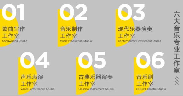我们开设了五大工作室并匹配专业方向,有歌曲写作工作室、音乐制作工作室、现代乐器演奏工作室、声乐表演工作室、古典乐器演奏工作室,使学生专业得以全面发展。