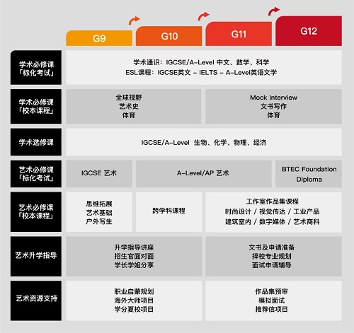 艺术高中课程体系包含国际学术课程、艺术设计课程和英语语言课程三大板块。通过严谨的课程设置满足不同学生个性化的升学需求。